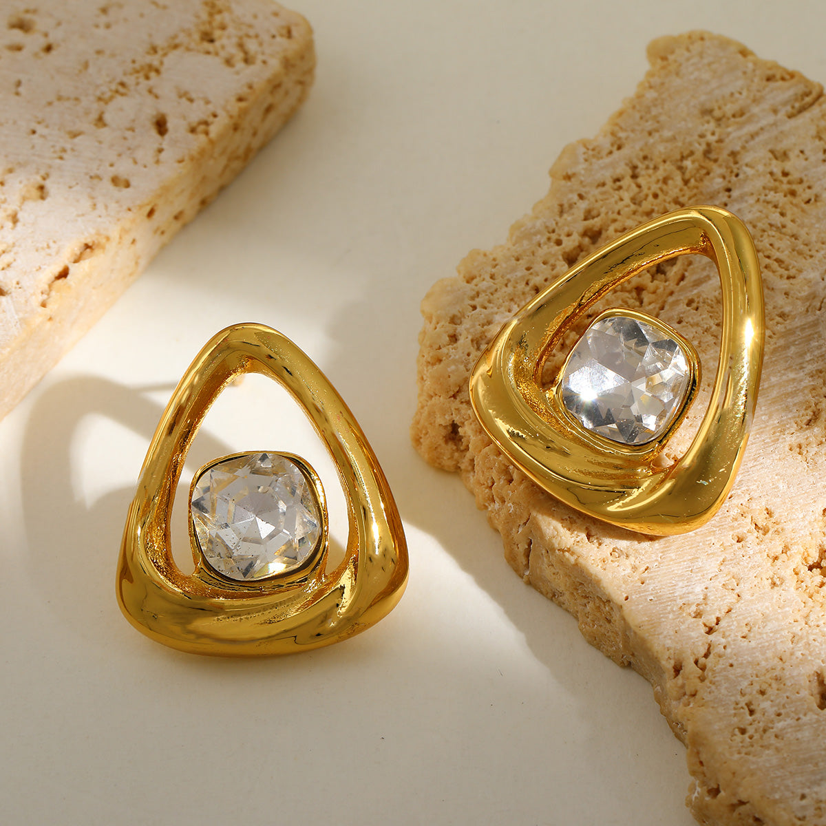 Experience timeless elegance with the Gemma earrings, featuring a refined triangle design embedded with sparkling zircon stones set in stainless steel with 18K gold accents. These earrings offer a sophisticated yet casual look, perfect for any season and occasion, blending classic charm with modern style effortlessly.