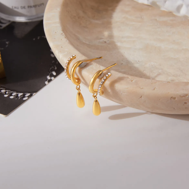 Level up your ear stack with these bold 18k gold-plated hoops, featuring a crystal-lined huggie and a sleek teardrop dangle for the perfect mix of shine + edge. Lightweight, eye-catching, and designed for everyday wear — the ultimate must-have for a modern, elevated look.