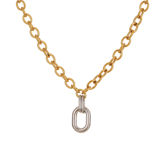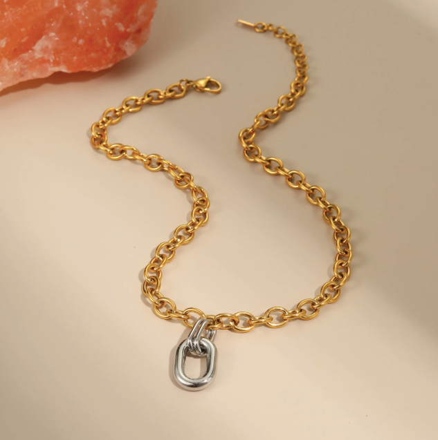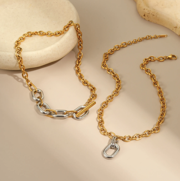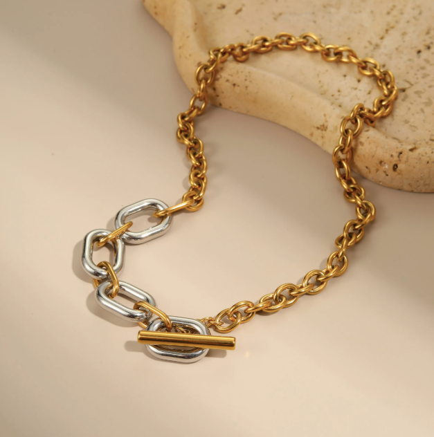 Make a statement with this striking color block stainless steel necklace that seamlessly blends gold and silver tones. The elegant design features a secure lobster clasp, ensuring your jewelry stays perfectly in place throughout the day. Crafted from durable stainless steel, this piece resists tarnishing and maintains its lustrous finish. Perfect for layering or wearing solo, this versatile necklace elevates any outfit with modern sophistication and timeless appeal.