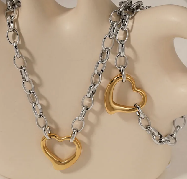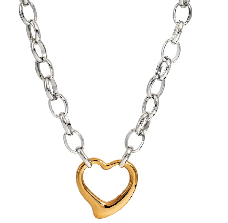 Fall in love with timeless elegance. This stainless steel heart necklace features a bold silver link chain and a gold plated heart pendant. blending modern edge with romantic charm Crafted from high- quality, tarnish resistant stainless steel. This piece is perfect for everyday wear or special occasion.
